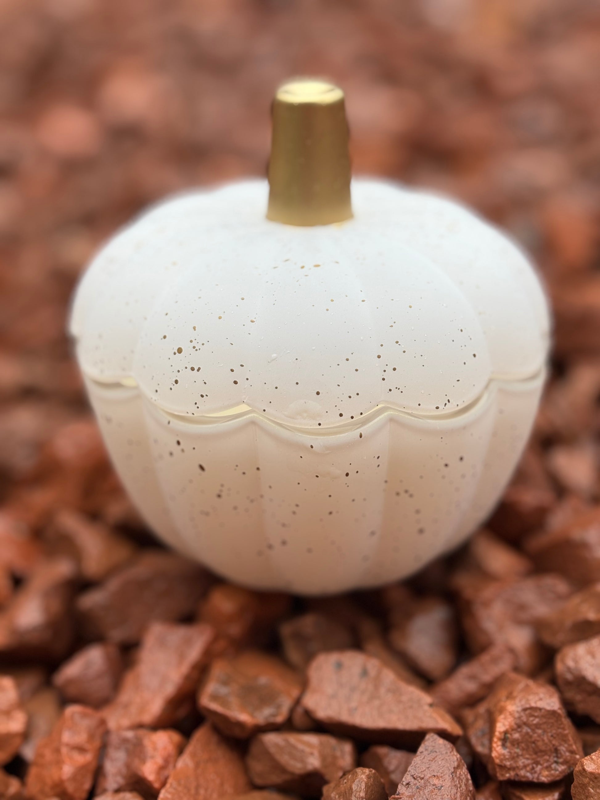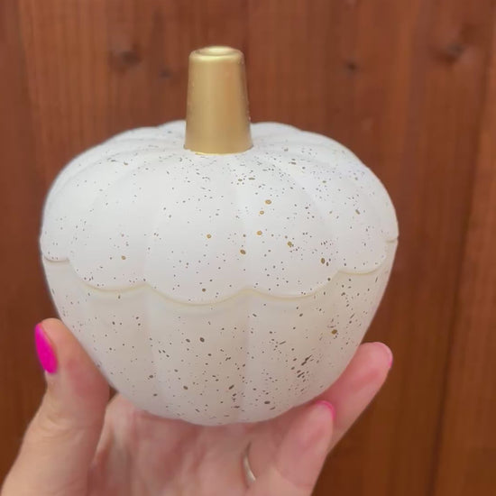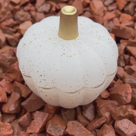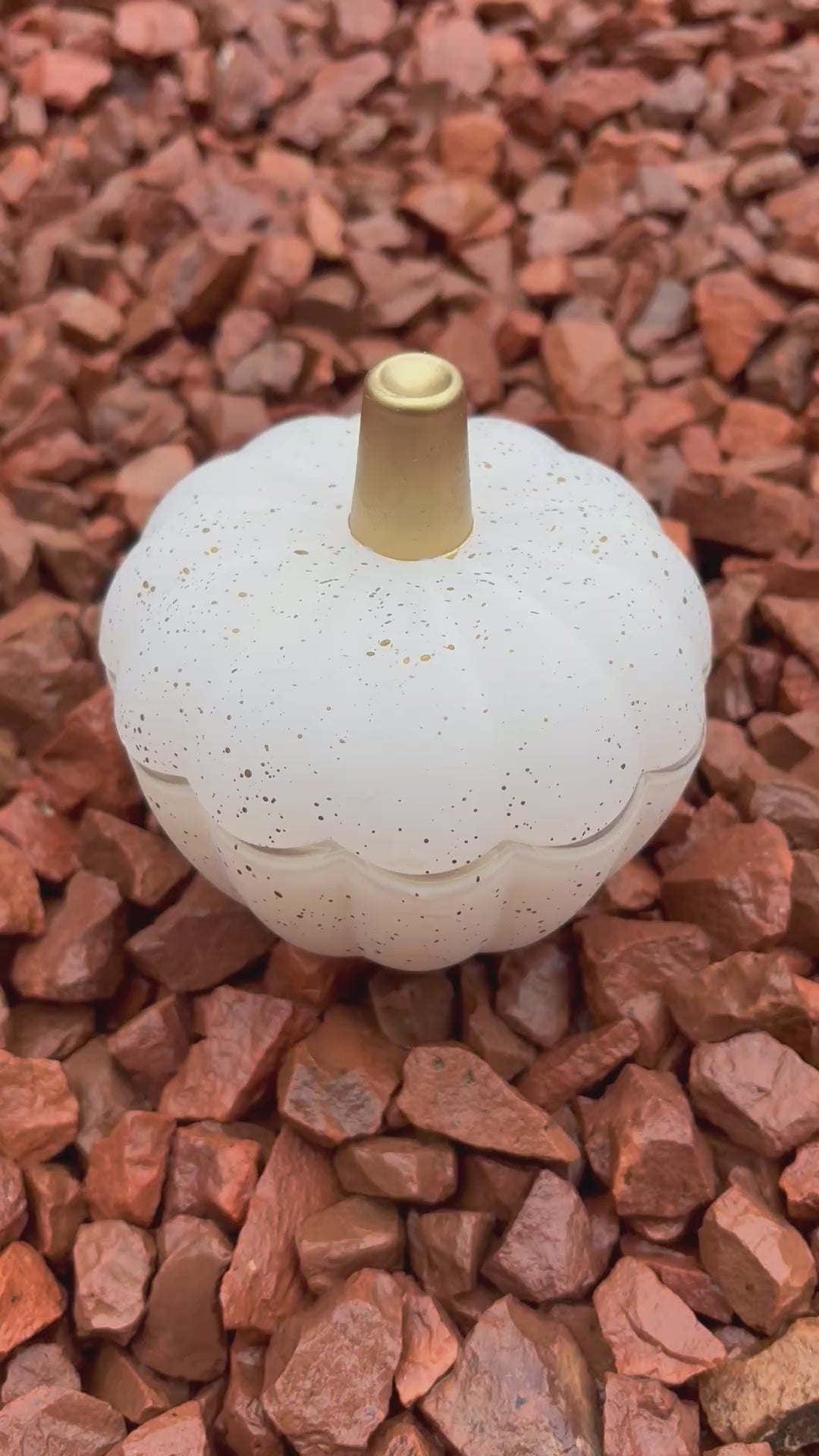 Bring the autumnal vibes to life with my Small Pumpkin Glass in White & Gold. Featuring a smooth white finish with gold specks, these modern pumpkin-shaped jars are perfect for autumn candle collections.